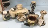 Torquay "Cottage" dinner plate & cup, Scandy jam dish, pinched lip jug, "Black Cockrell" sugar, Hat pin holder 5"h. Torquay "Cottage" dinner plate & cup, Scandy jam dish, pinched lip jug, "Black Cockrell" sugar, Hat pin holder 5"h.
