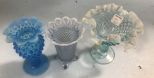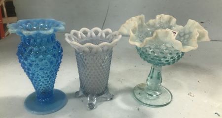 Fenton snow crest candy dish, hobnail, footed, Fenton vented snow crest/footed vase, Fenton blue hobnail footed vase 6"h. Fenton snow crest candy dish, hobnail, footed, Fenton vented snow crest/footed vase, Fenton blue hobnail footed vase 6"h.