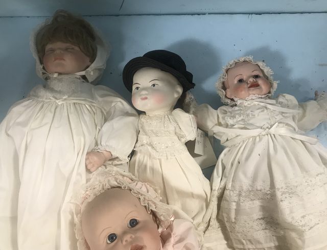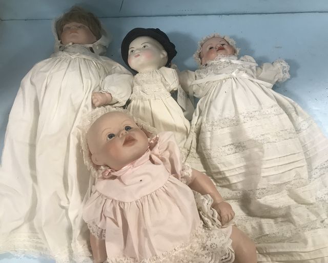 Three porcelain collectible dolls and one plastic doll. Three porcelain collectible dolls and one plastic doll.