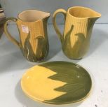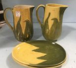 Two Corn large corn pitchers 8"h., and large corn plates. Two Corn large corn pitchers 8"h., and large corn plates.