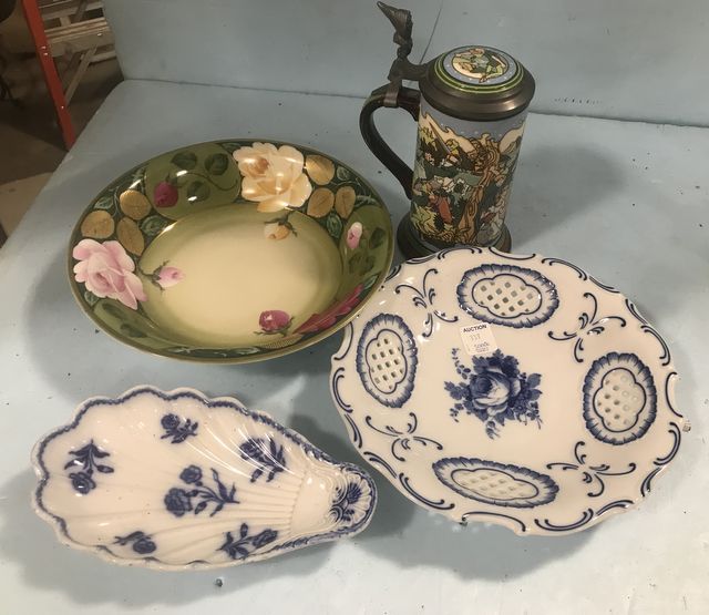 Hand painted "Royal Munich" deep dish/roses on green, marked, two blue on white bowls vented, Peter pan mug by Barrie 7"h. Hand painted "Royal Munich" deep dish/roses on green, marked, two blue on white bowls vented, Peter pan mug by Barrie 7"h.