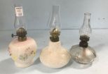 Miniature lamps, clear glasss "draped suat", chimney 6"h., milk glass "Colonial Eagle", chimney. Miniature lamps, clear glasss "draped suat", chimney 6"h., milk glass "Colonial Eagle", chimney.
