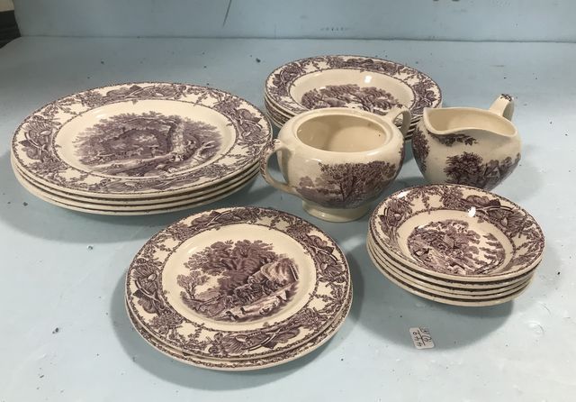 Farm scenes and farm tools, marked, 4 dinner plates, 5 bowls, 5 small bowls, 2 small plates, plus cream and sugar, no lid. Farm scenes and farm tools, marked, 4 dinner plates, 5 bowls, 5 small bowls, 2 small plates, plus cream and sugar, no lid.