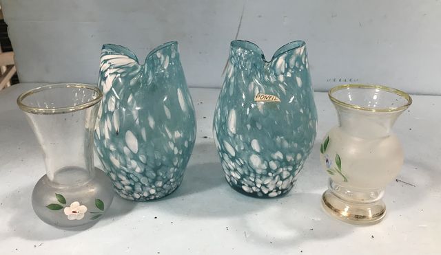 Pair of splatter glass blue, pinched lip, pontil vases 5"h., and pair of miniature hand painted satin glass vases. Pair of splatter glass blue, pinched lip, pontil vases 5"h., and pair of miniature hand painted satin glass vases.