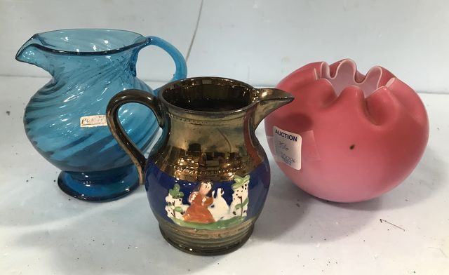 Copper luster hand painted pitcher with two ladies, pontil pink satin rose bowl, Pontil blue twist pitcher. Copper luster hand painted pitcher with two ladies, pontil pink satin rose bowl, Pontil blue twist pitcher.