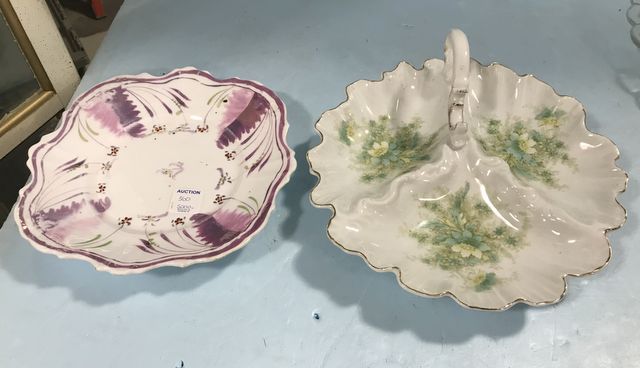Pink luster plate, square, fancy edge 9"w., divided candy dish with handle and flower decor. Pink luster plate, square, fancy edge 9"w., divided candy dish with handle and flower decor.