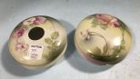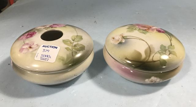 Matching R.S. Prussia Hair Receiver 5"w. and Poweder Box, green flowers, marked. Matching R.S. Prussia Hair Receiver 5"w. and Poweder Box, green flowers, marked.