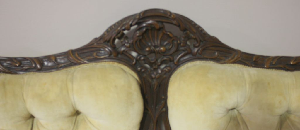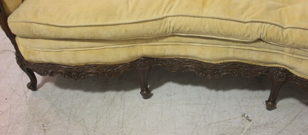 Heavily carved French style sofa covered in velvet; 80" w., 26" d., 36" h. Heavily carved French style sofa covered in velvet; 80" w., 26" d., 36" h.