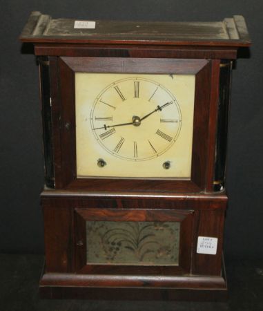 Mid 19th century Rosewood mantle clock with painted pilasters, painted door section, has key and pendulum; 10" w., 14" h. Mid 19th century Rosewood mantle clock with painted pilasters, painted door section, has key and pendulum; 10" w., 14" h.