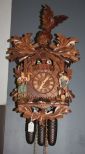 Heavily carved German Black Forest cuckoo clock with eagle carving and figures; 21" h. Heavily carved German Black Forest cuckoo clock with eagle carving and figures; 21" h.