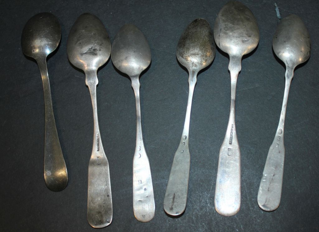 Two coin silver spoons marked pure coin E. Newberry, two marked with an eagle, silverplate sauce spoon Two coin silver spoons marked pure coin E. Newberry, two marked with an eagle, silverplate sauce spoon