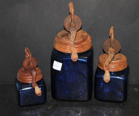 Reproduction blue glass Dazey churns; #20 - 12" h., #10 - 9" h., #5 - 7" h. Reproduction blue glass Dazey churns; #20 - 12" h., #10 - 9" h., #5 - 7" h.