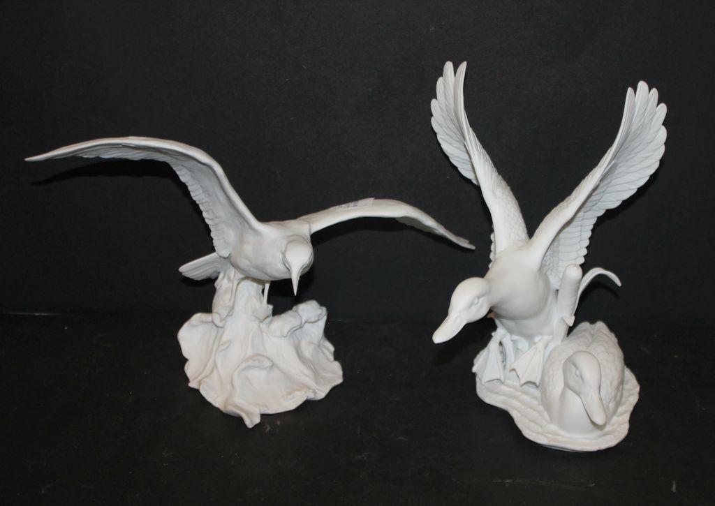 Two ducks 6" w., 8" h. (one flying) and other figurine of bird on perch 13" w., 7 1/2" h. Two ducks 6" w., 8" h. (one flying) and other figurine of bird on perch 13" w., 7 1/2" h.