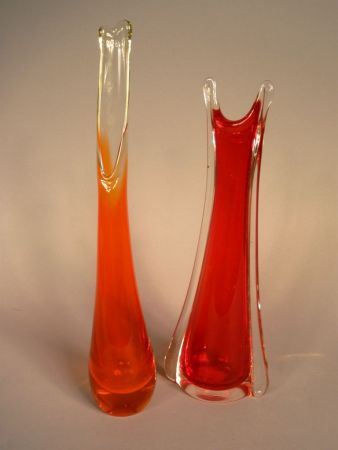 Art Glass Vase to left attributed to Fratelli Toso, circa. 1960, and one to right is Seguso w/Somerso internal coloring, circa. 1950, with internal hairline 2" up. Orange 14 1/2"h, red 12 1/2"h Art Glass Vase to left attributed to Fratelli Toso, circa. 1960, and one to right is Seguso w/Somerso internal coloring, circa. 1950, with internal hairline 2" up. Orange 14 1/2"h, red 12 1/2"h
