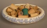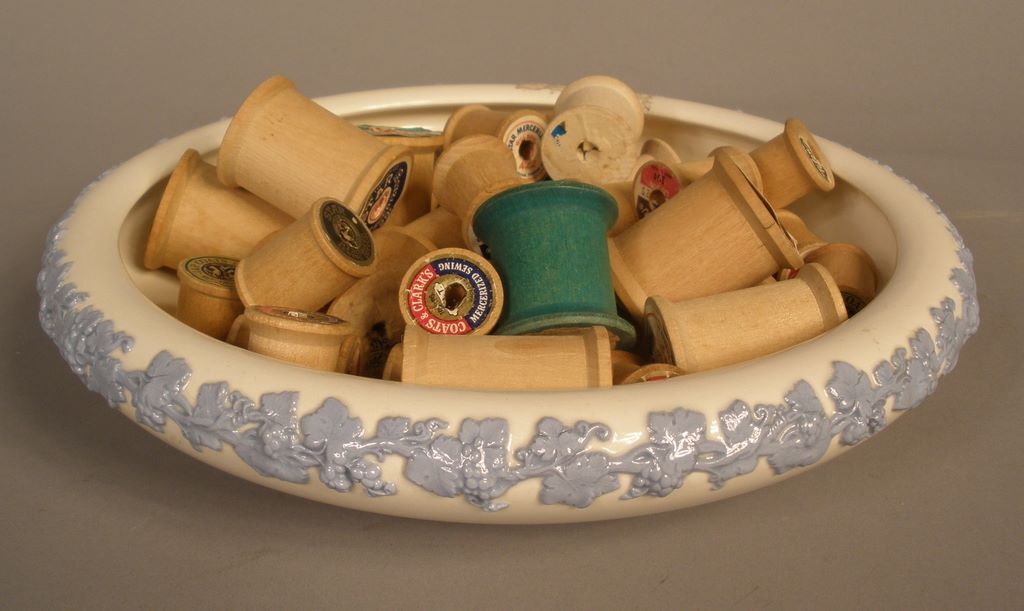 Wedgwood Queensware Narcissus Bowl with blue glazed Jasperware trim, 10 3/8" x 2"deep, filled with 37 Wood Thread Spools Wedgwood Queensware Narcissus Bowl with blue glazed Jasperware trim, 10 3/8" x 2"deep, filled with 37 Wood Thread Spools