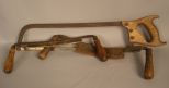 Collection of Primitive Hand Tools. Handsaw w/wooden handle, used to saw meat, 25 1/2" long; double handled draw knife, 18" long; de-barking knife (bark skinner) from lumber operation in the Gaspe Peninsula of Quebec Collection of Primitive Hand Tools. Handsaw w/wooden handle, used to saw meat, 25 1/2" long; double handled draw knife, 18" long; de-barking knife (bark skinner) from lumber operation in the Gaspe Peninsula of Quebec