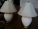 White ginger jar shape lamps w/shell design and brass details. H. 26 1/4", 35 1/2" round White ginger jar shape lamps w/shell design and brass details. H. 26 1/4", 35 1/2" round