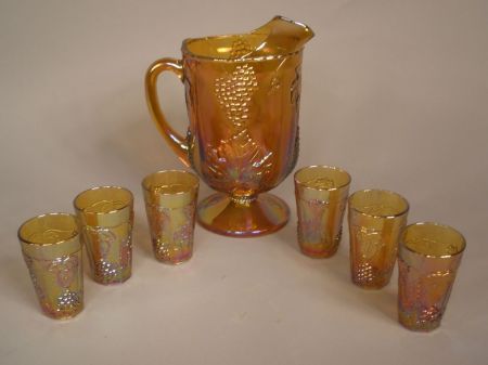 Indiana Glass Pitcher and 6 Juice Glasses. Marigold carnival glass, in Harvest grape pattern. Pitcher 10 1/4" high, tumblers 4" tall, 2 1/2" round Indiana Glass Pitcher and 6 Juice Glasses. Marigold carnival glass, in Harvest grape pattern. Pitcher 10 1/4" high, tumblers 4" tall, 2 1/2" round