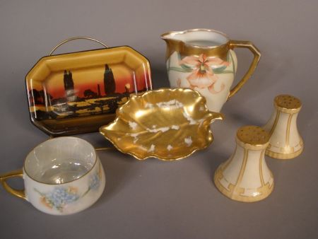 Five Assorted Items. Bavarian Salt and Pepper, 2 1/4"h; Rosenthal Demitasse Cup, 1 1/2"h; Italian cream pitcher w/gold trim, marked Ginori, 4"h.; Royal Doulton Pin Tray, 5 1/2" w; Limoges Trinket Tray, 5" Five Assorted Items. Bavarian Salt and Pepper, 2 1/4"h; Rosenthal Demitasse Cup, 1 1/2"h; Italian cream pitcher w/gold trim, marked Ginori, 4"h.; Royal Doulton Pin Tray, 5 1/2" w; Limoges Trinket Tray, 5"