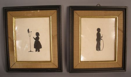 Pair of Silhouettes in Black Frames. Images of children at play. 7 1/2"w x 8 1/2"h Pair of Silhouettes in Black Frames. Images of children at play. 7 1/2"w x 8 1/2"h