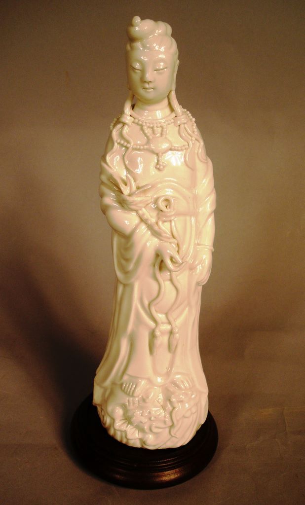 Delicate Blanc de Chine porcelain figurine on stand of the Goddess of Compassion, Guanyin. Fine Chinese porcelain art form with impressed calligraphic marks, 11 1/2"h. Delicate Blanc de Chine porcelain figurine on stand of the Goddess of Compassion, Guanyin. Fine Chinese porcelain art form with impressed calligraphic marks, 11 1/2"h.