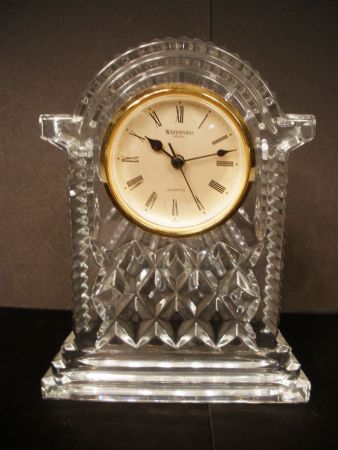 Waterford Crystal Clock. Deco design crystal quartz clock. h. 7 1/2", w. 5 1/2" Waterford Crystal Clock. Deco design crystal quartz clock. h. 7 1/2", w. 5 1/2"