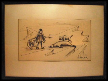Robert Mayokak Pen & Ink Drawing. "Eskimo Walrus Hunt", by Robert Mayokok, Alaskan native artist, 1957. 22" w x 15 1/2"h. Robert Mayokak Pen & Ink Drawing. "Eskimo Walrus Hunt", by Robert Mayokok, Alaskan native artist, 1957. 22" w x 15 1/2"h.