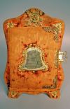 Old Fabric Covered Photo Album on Stand w/mirror in shape of bell on front. Album is full of old black and white photos. 15"h x 11 1/4"w. Old Fabric Covered Photo Album on Stand w/mirror in shape of bell on front. Album is full of old black and white photos. 15"h x 11 1/4"w.