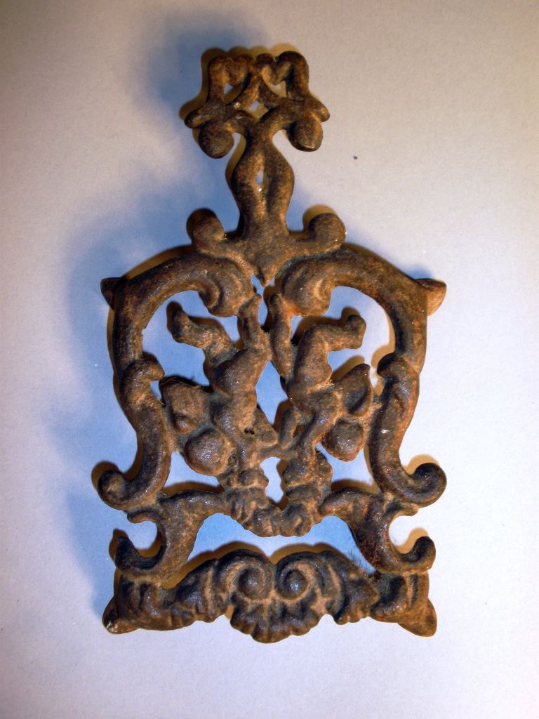 Ornate iron kitchen trivet with scroll design and cherubs. 8"L x 4"W Ornate iron kitchen trivet with scroll design and cherubs. 8"L x 4"W