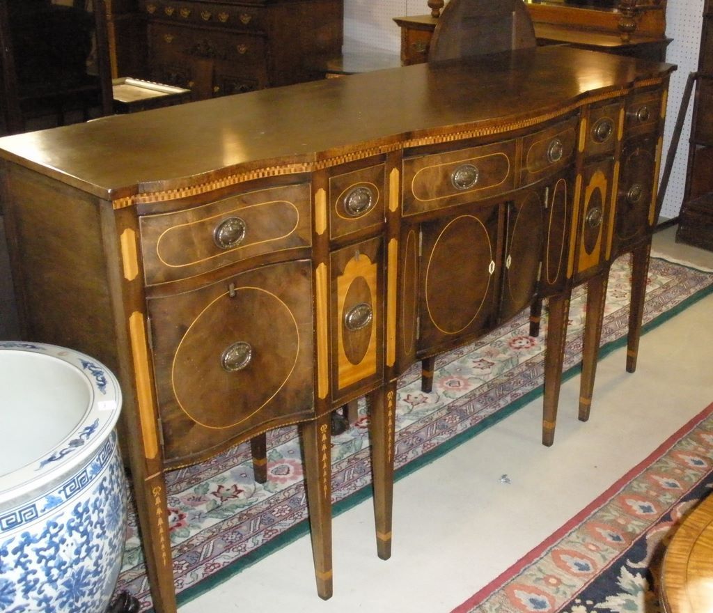 Dining Set, consisting of George III style table with beautiful banded inlay. 8 Chippendale Chairs and Hepplewhite Sideboard with string inlay, w. 76", h. 41 1/2", d. 22" Dining Set, consisting of George III style table with beautiful banded inlay. 8 Chippendale Chairs and Hepplewhite Sideboard with string inlay, w. 76", h. 41 1/2", d. 22"