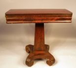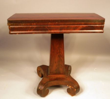 1840's Mahogany Empire Card Table. Top swivels to expose interior on small plinth with scroll feet. h. 30 1/2", d. 16 1/2", w. 33 1/2" 1840's Mahogany Empire Card Table. Top swivels to expose interior on small plinth with scroll feet. h. 30 1/2", d. 16 1/2", w. 33 1/2"