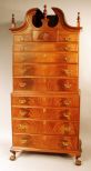 Flame Mahogany Bonnet Top Highboy, Mid-19th Century. Top section has broken pediment w/three finials. 6 graduated drawers w/shell carving in center drawer. Bottom section has four graduated drawers on base w/Chippendale ball and claw feet. 39"w x 20"d x 7'4"h Flame Mahogany Bonnet Top Highboy, Mid-19th Century. Top section has broken pediment w/three finials. 6 graduated drawers w/shell carving in center drawer. Bottom section has four graduated drawers on base w/Chippendale ball and claw feet. 39"w x 20"d x 7'4"h