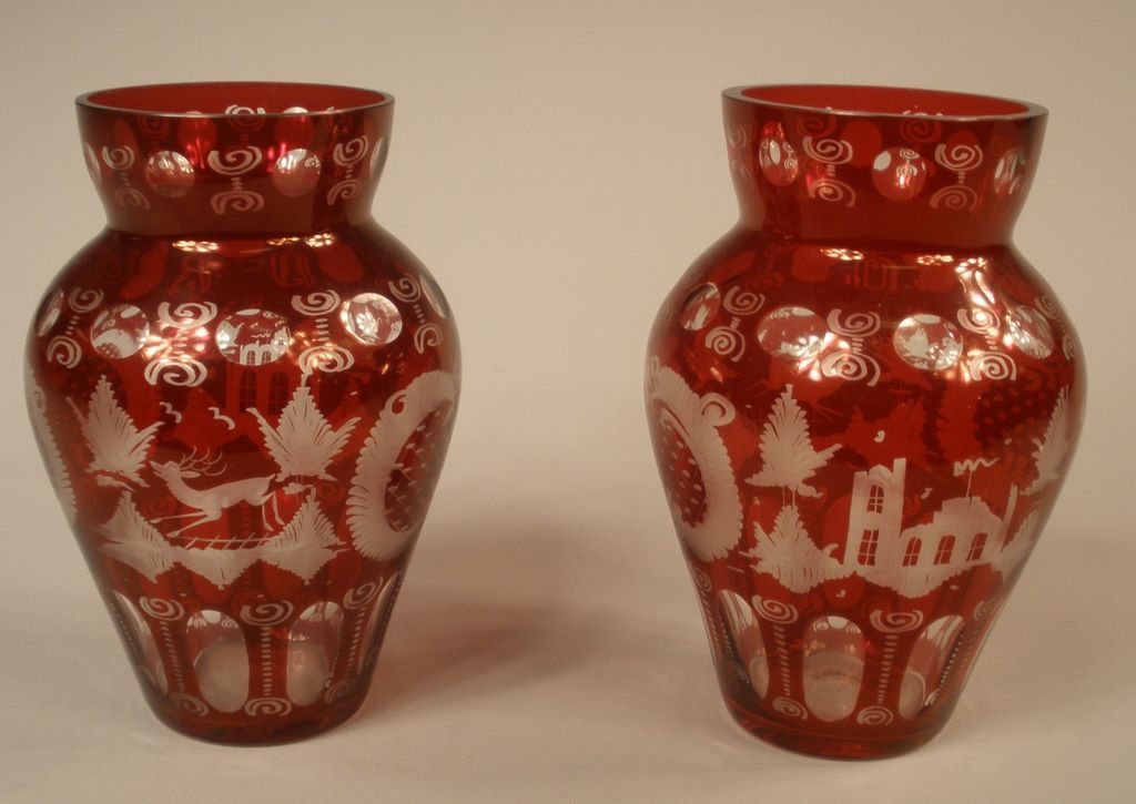 Beautiful pair of ruby cut to clear mantle vases. The vases feature etching of deer, foliage and a manor. Excellent condition! 10" tall Beautiful pair of ruby cut to clear mantle vases. The vases feature etching of deer, foliage and a manor. Excellent condition! 10" tall