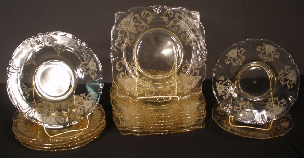 c1930 Heisey Sahara (yellow) "Empress" etched plates, unidentified etching very similar to Carcasonne. 5 round, 2 small round and 8 square. c1930 Heisey Sahara (yellow) "Empress" etched plates, unidentified etching very similar to Carcasonne. 5 round, 2 small round and 8 square.