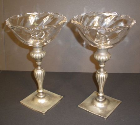 Pair of silver plate candlestick holders with c1940-1957 Heisey "Waverly" epergnettes, 9 1/2" tall, 6" glass bowl Pair of silver plate candlestick holders with c1940-1957 Heisey "Waverly" epergnettes, 9 1/2" tall, 6" glass bowl