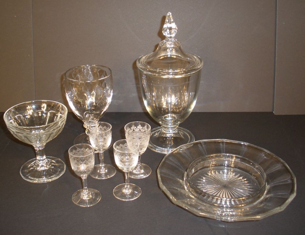 Assorted Heisey Items: Heisey sherbet glass 4"h; "Revere" candy jar w/top 9 1/2"h; 4 cordials 3"h; water glass 5/12"h; butter dish (missing top) 7 3/4" base Assorted Heisey Items: Heisey sherbet glass 4"h; "Revere" candy jar w/top 9 1/2"h; 4 cordials 3"h; water glass 5/12"h; butter dish (missing top) 7 3/4" base