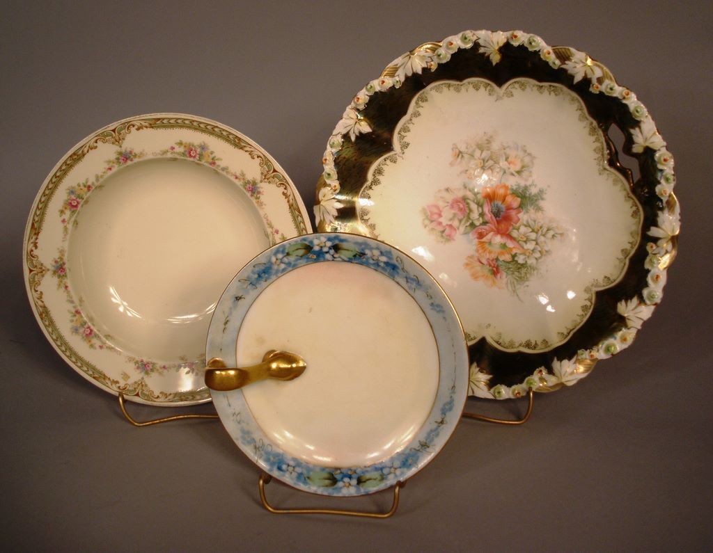 Collection of Three Hand Painted Plates: A Bavarian Nappy decorated by Kimball Art Shop, 6"; an 8" EPIAG Germany "Laurella" soup bowl; and a stunning c1875-1880 RS Germany Steeple Mark 9 1/2" handled cake plate with bronze iridescent Tiffany finish. (Rarely seen, Steeple Mark RS Germany/Prussia is ornately fashioned & richly decorated, and predates the wreath & star mark usually found on Schlegelmilch porcelain.) Collection of Three Hand Painted Plates: A Bavarian Nappy decorated by Kimball Art Shop, 6"; an 8" EPIAG Germany "Laurella" soup bowl; and a stunning c1875-1880 RS Germany Steeple Mark 9 1/2" handled cake plate with bronze iridescent Tiffany finish. (Rarely seen, Steeple Mark RS Germany/Prussia is ornately fashioned & richly decorated, and predates the wreath & star mark usually found on Schlegelmilch porcelain.)
