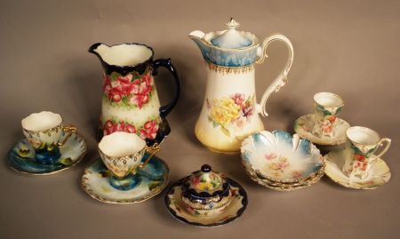 Collection of Fine Porcelain Items, RS Prussia 2 Cups & Saucers (handle broken on one); RS Prussia Teapot, blue/yellow, 9 1/2" tall; Nippon Pitcher, cobalt roses, 7" tall; 2 RS Prussia Berry Bowls, 5 1/4" round; Nippon Covered Sauce w/attached Plate, 4" round. Collection of Fine Porcelain Items, RS Prussia 2 Cups & Saucers (handle broken on one); RS Prussia Teapot, blue/yellow, 9 1/2" tall; Nippon Pitcher, cobalt roses, 7" tall; 2 RS Prussia Berry Bowls, 5 1/4" round; Nippon Covered Sauce w/attached Plate, 4" round.