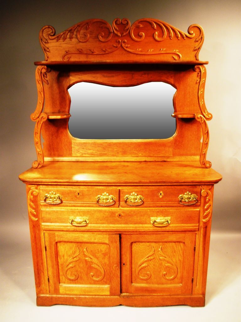 Victorian Oak Sideboard. Top section having beveled glass mirror w/long shelf over two small shelves supported by carved scrolls. Bottom section is two drawers over one long drawer w/two doors beneath that. w. 48", h. 72", d. 20" Victorian Oak Sideboard. Top section having beveled glass mirror w/long shelf over two small shelves supported by carved scrolls. Bottom section is two drawers over one long drawer w/two doors beneath that. w. 48", h. 72", d. 20"