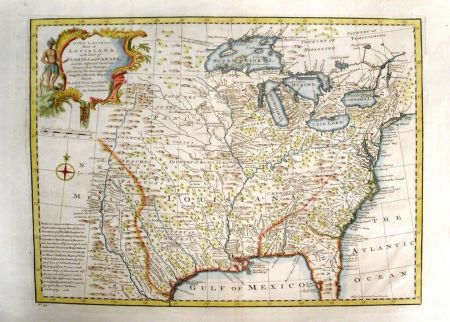 Map of Louisiana w/Pt. Florida and Canada and Adjacent Countries, Maker: Emanuel Bowen, 1747, London, 17" x 14". Condition: Very Good+. Drawn from Surveys assisted by the most approved English and French Maps and Charts. Striking map the British, Spanish and French Colonies in North America on the eve of the French and Indian War. The map includes a fascinating annotation, which attributes the cartographic detail in the region to the maps of Charlevoix and Bellin, which had been issued in the years immediately preceding the issuance of this map and were drawn from French explorations in the Great Lakes, Ohio Valley and Mississippi Valley, which had dramatically improved upon the information available to Henry Popple and other British mapmakers of the prior decade. Coming immediately before the landmark large format maps of D'Anville and Mitchell, the present map presents one of the most interesting depictions of and Anglocentric view of the future United States during the period. The map clearly emphasizes the newly updated cartographic information in the Mississippi Valley and Great Lakes regions, showing significantly more information than prior British Maps of the region. The treatment of the British Colonies also reflects significant new information, undoubtedly compiled from the freshly available surveys which would have been making it across the Atlantic to the Board of Trade from the various British Colonies, especially those south of the Chesapeake region which were only just beginning to flourish commercially. The most curious element of the map is its bold depiction of the Rio Grande, which extends far to the North of its true sources and greatly distorts the geography of the region drained by the river. A number of towns such as Santa Fe and Taos are shown on the Rio Grande, and a number of the early Spanish roads in the region are also shown. Excellent detail in the Mississippi Valley. Many early Indian Tribal lands are located. Nice treatment of the Great Lakes. Excellent detail throughout, including extensive annotations. Map of Louisiana w/Pt. Florida and Canada and Adjacent Countries, Maker: Emanuel Bowen, 1747, London, 17" x 14". Condition: Very Good+. Drawn from Surveys assisted by the most approved English and French Maps and Charts. Striking map the British, Spanish and French Colonies in North America on the eve of the French and Indian War. The map includes a fascinating annotation, which attributes the cartographic detail in the region to the maps of Charlevoix and Bellin, which had been issued in the years immediately preceding the issuance of this map and were drawn from French explorations in the Great Lakes, Ohio Valley and Mississippi Valley, which had dramatically improved upon the information available to Henry Popple and other British mapmakers of the prior decade. Coming immediately before the landmark large format maps of D'Anville and Mitchell, the present map presents one of the most interesting depictions of and Anglocentric view of the future United States during the period. The map clearly emphasizes the newly updated cartographic information in the Mississippi Valley and Great Lakes regions, showing significantly more information than prior British Maps of the region. The treatment of the British Colonies also reflects significant new information, undoubtedly compiled from the freshly available surveys which would have been making it across the Atlantic to the Board of Trade from the various British Colonies, especially those south of the Chesapeake region which were only just beginning to flourish commercially. The most curious element of the map is its bold depiction of the Rio Grande, which extends far to the North of its true sources and greatly distorts the geography of the region drained by the river. A number of towns such as Santa Fe and Taos are shown on the Rio Grande, and a number of the early Spanish roads in the region are also shown. Excellent detail in the Mississippi Valley. Many early Indian Tribal lands are located. Nice treatment of the Great Lakes. Excellent detail throughout, including extensive annotations.