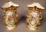 c1860-1880 finely decorated pair of Old Paris mantle vases, heavily gilded, w/handpainted romantic courtship scenes and tassel handles, each 9"h x 7"w. c1860-1880 finely decorated pair of Old Paris mantle vases, heavily gilded, w/handpainted romantic courtship scenes and tassel handles, each 9"h x 7"w.