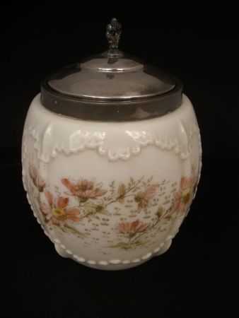 c1900 Wave Crest 9" biscuit barrel in opal ware with delicate floral decoration. An American Art Glass patented in 1892 by the C.F. Monroe Co., never reproduced. c1900 Wave Crest 9" biscuit barrel in opal ware with delicate floral decoration. An American Art Glass patented in 1892 by the C.F. Monroe Co., never reproduced.
