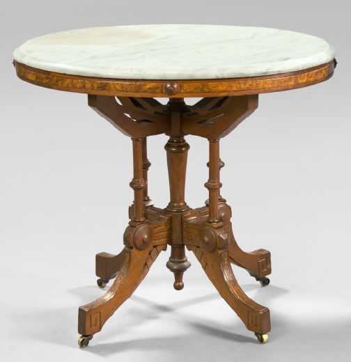American Walnut, Burl Walnut and Marble-Top Center Table, Third Quarter 19th Century, the oval white marble top resting on a burl-paneled frame with turned rosettes, supported by a central turned standard flanked by four turned spindles and outstretched legs, h. 29", w. 31-1/2", d. 24-1/4". American Walnut, Burl Walnut and Marble-Top Center Table, Third Quarter 19th Century, the oval white marble top resting on a burl-paneled frame with turned rosettes, supported by a central turned standard flanked by four turned spindles and outstretched legs, h. 29", w. 31-1/2", d. 24-1/4".