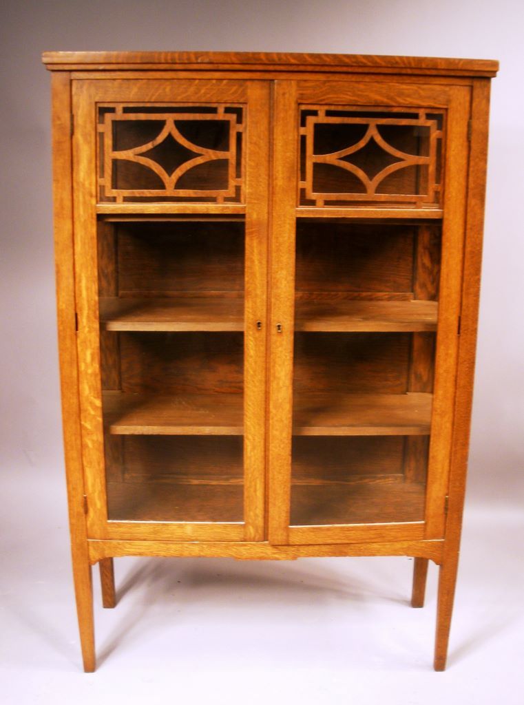Great mission oak style china cabinet/bookcase w/2 glass doors having lattice work on top of each glass door. Cleaned but still has good finish. Missing two hinges in center of each door. 38 1/2"w x 15"d x 61"h Great mission oak style china cabinet/bookcase w/2 glass doors having lattice work on top of each glass door. Cleaned but still has good finish. Missing two hinges in center of each door. 38 1/2"w x 15"d x 61"h