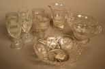 Collection of 9 Glass Items. "Near Cut" 5 1/2" bowl, six early American pattern glass 3 3/8" cordials, 3"h sugar and creamer Duncan Miller Dewdrop. Collection of 9 Glass Items. "Near Cut" 5 1/2" bowl, six early American pattern glass 3 3/8" cordials, 3"h sugar and creamer Duncan Miller Dewdrop.