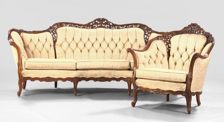 Two-Piece Rococo Revival Pierce-Carved and Stained Walnut Parlor Suite, ca. 1920, consisting of a large three-cushion sofa, h. 37", w. 93", d. 25", and a wrap-around armchair, h. 37", each with floral crests, diamond-tufted padded backs and cabriole legs. Two-Piece Rococo Revival Pierce-Carved and Stained Walnut Parlor Suite, ca. 1920, consisting of a large three-cushion sofa, h. 37", w. 93", d. 25", and a wrap-around armchair, h. 37", each with floral crests, diamond-tufted padded backs and cabriole legs.