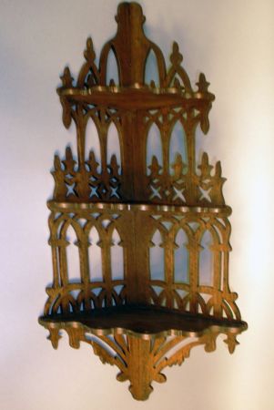 Walnut Gothic style ornately carved corner hanging cabinet, h. 32", w. 12 1/2" Walnut Gothic style ornately carved corner hanging cabinet, h. 32", w. 12 1/2"