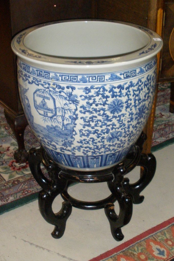 Great Chinese Blue & White Porcelain Jardiniere on Teak Stand, 21"w x 30"h. Great Chinese Blue & White Porcelain Jardiniere on Teak Stand, 21"w x 30"h.