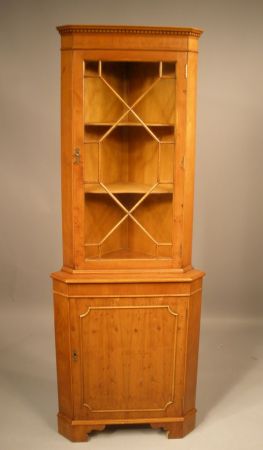 Pine Chippendale style corner cabinet. Top has dental molding and glass door has lattice work. Bottom section is one door w/simple panel. All raised on bracket feet. 25 1/2"w x 15"d x 71"h Pine Chippendale style corner cabinet. Top has dental molding and glass door has lattice work. Bottom section is one door w/simple panel. All raised on bracket feet. 25 1/2"w x 15"d x 71"h