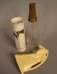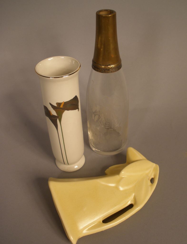 Three Assorted Items: Otagirai Vase, Japan; 1900 Hand Blown Bottle; 1940s McCoy Pottery Yellow Pastel Matte "Lily Bud" Wall Pocket, NM mark. Three Assorted Items: Otagirai Vase, Japan; 1900 Hand Blown Bottle; 1940s McCoy Pottery Yellow Pastel Matte "Lily Bud" Wall Pocket, NM mark.